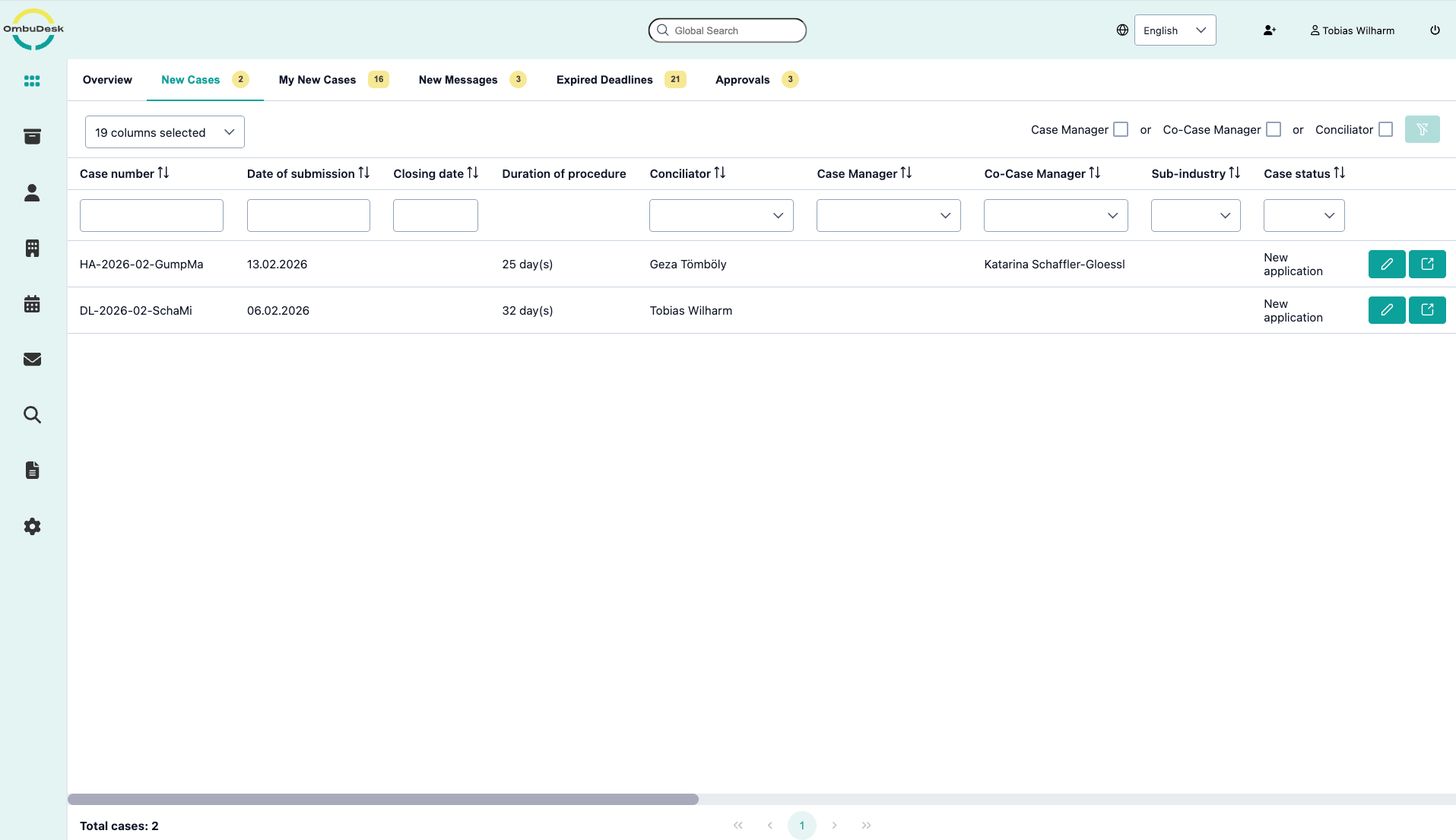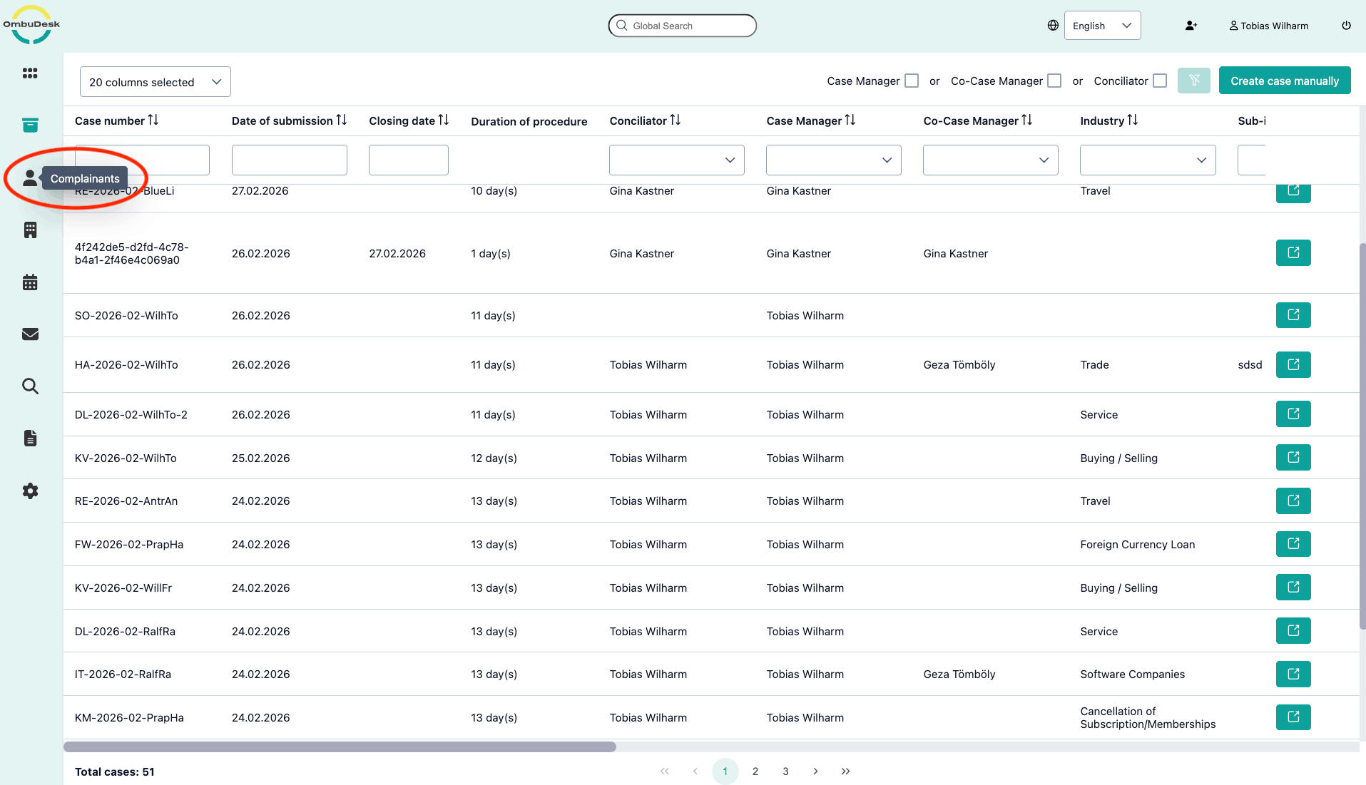 Each complaint is assigned to a complainant, although representatives acting on behalf of the complainant can also be entered. When a complainant opens their first case, a master record is created for them. For subsequent messages, document uploads and other possible actions the correct complaint is identified – by the email address of the complainant – and automatically assigned to the complaint. All complaints assigned to a complainant are listed in their detail view. From there, you can navigate directly to the relevant complaint. It is also possible to search for and filter complainants.