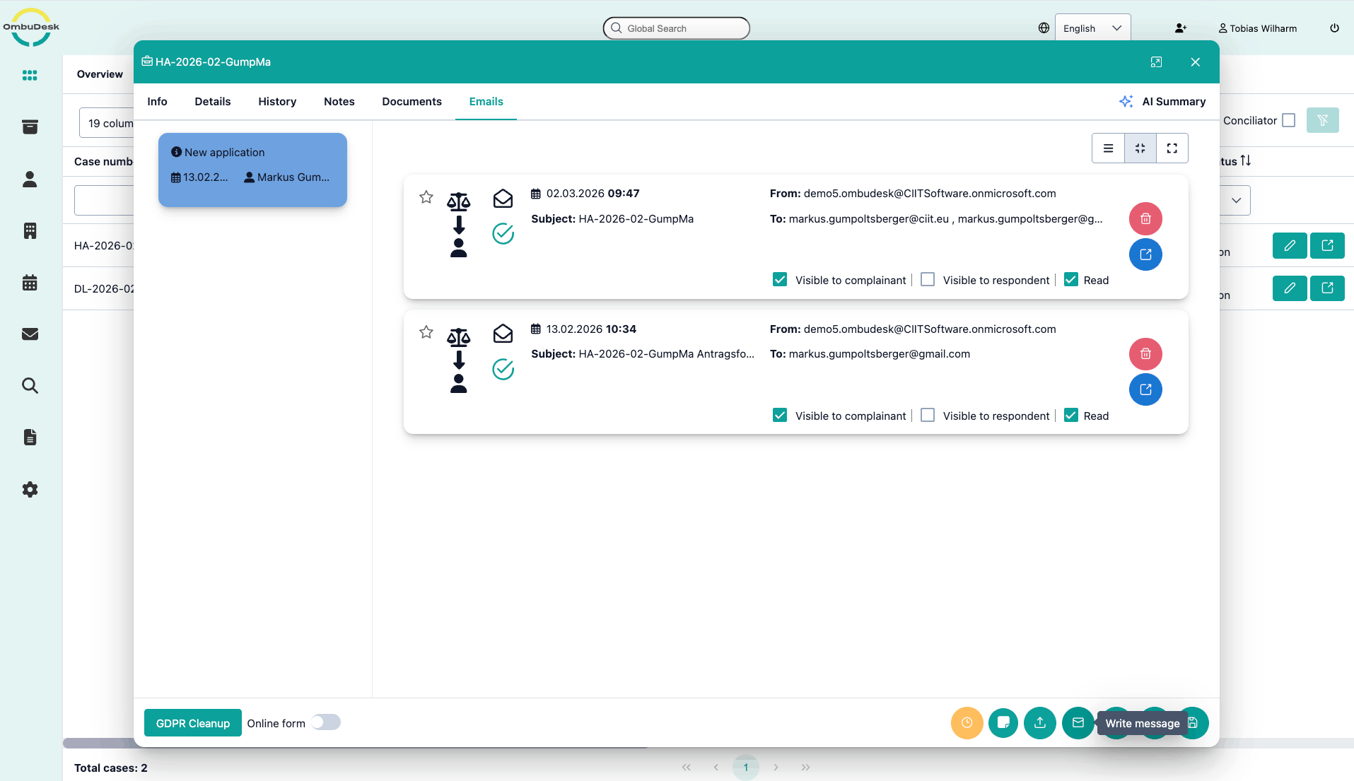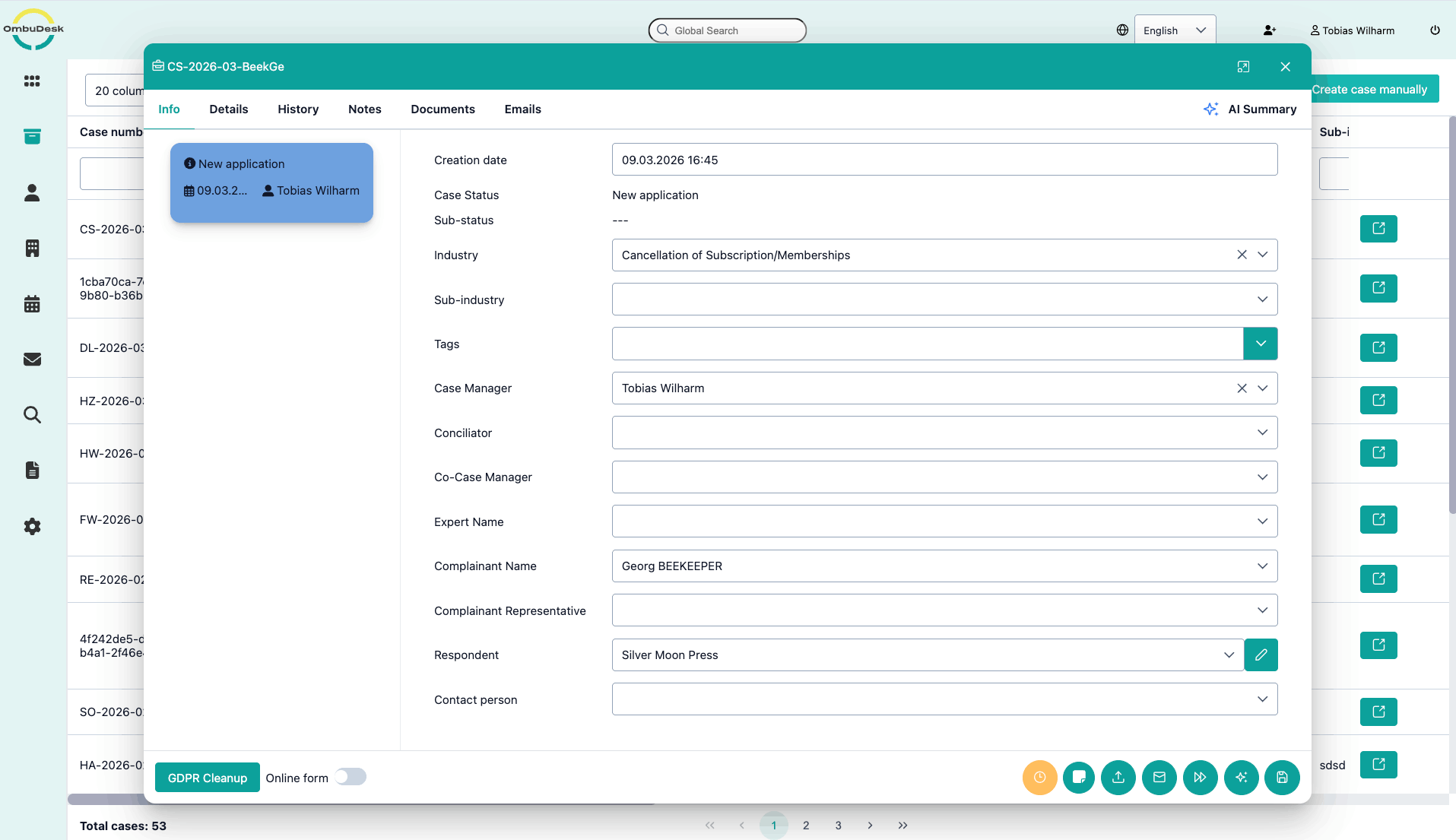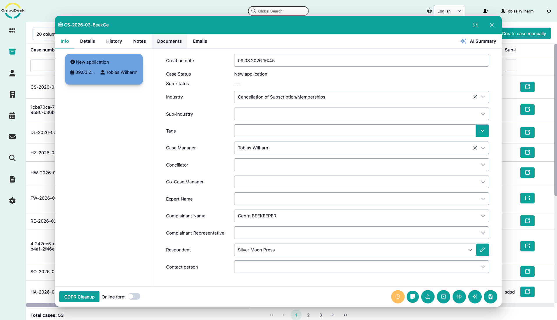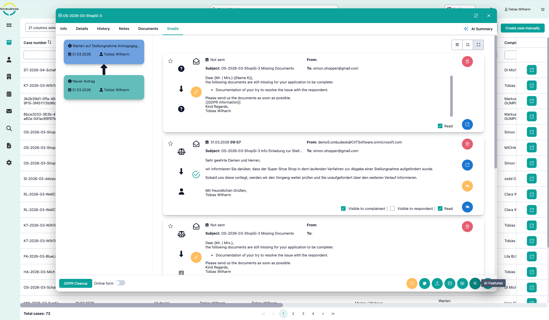 The central tool in OmbuDesk is the file view or the complaint view. All data from the application form is displayed here. The complaint has an assigned status, and the timeline of all events is shown. This includes all messages, uploaded documents, deadlines, and status changes. Additionally each action leaves a trail, so it is clear who performed it and when.