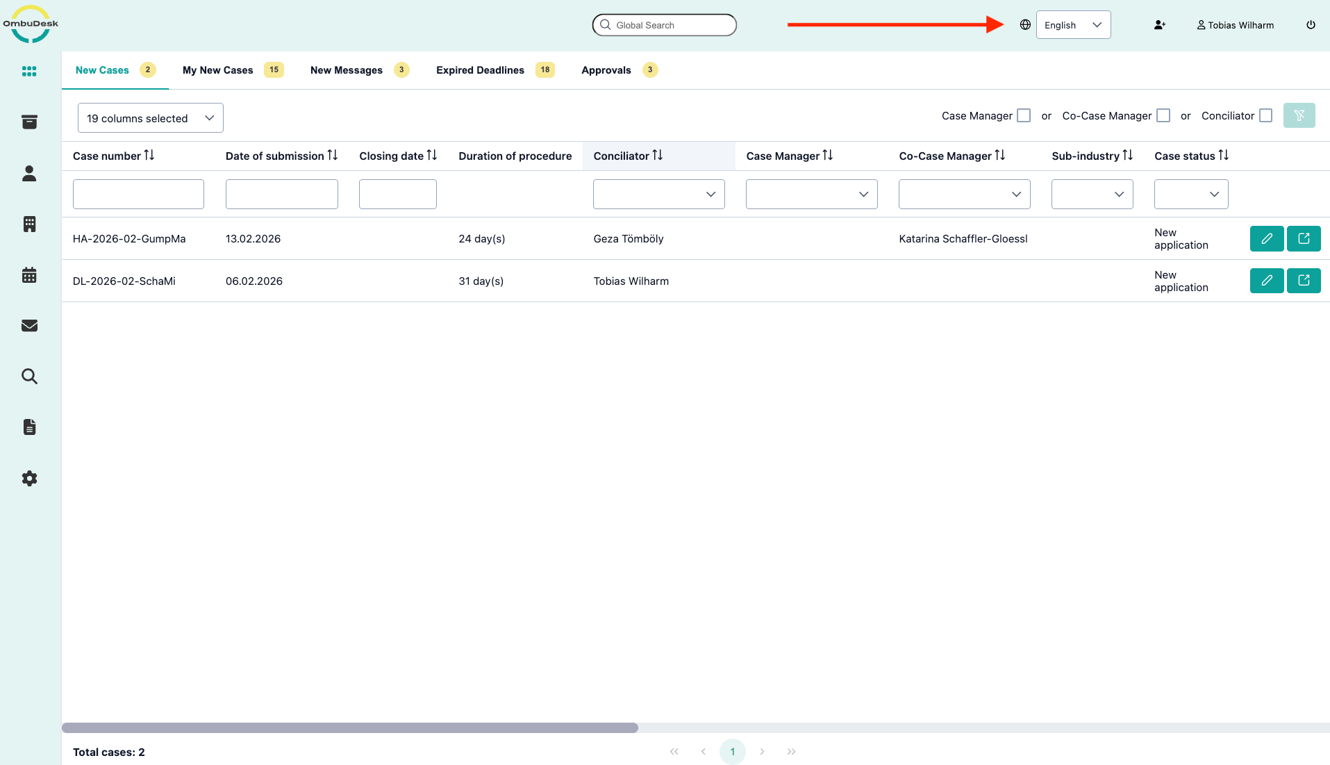 The application is available in German and English as standard for both administrators and complainants/respondents. The language displayed depends on the user's browser settings. However, the language can also be changed manually. Any additional languages can be added on request.
