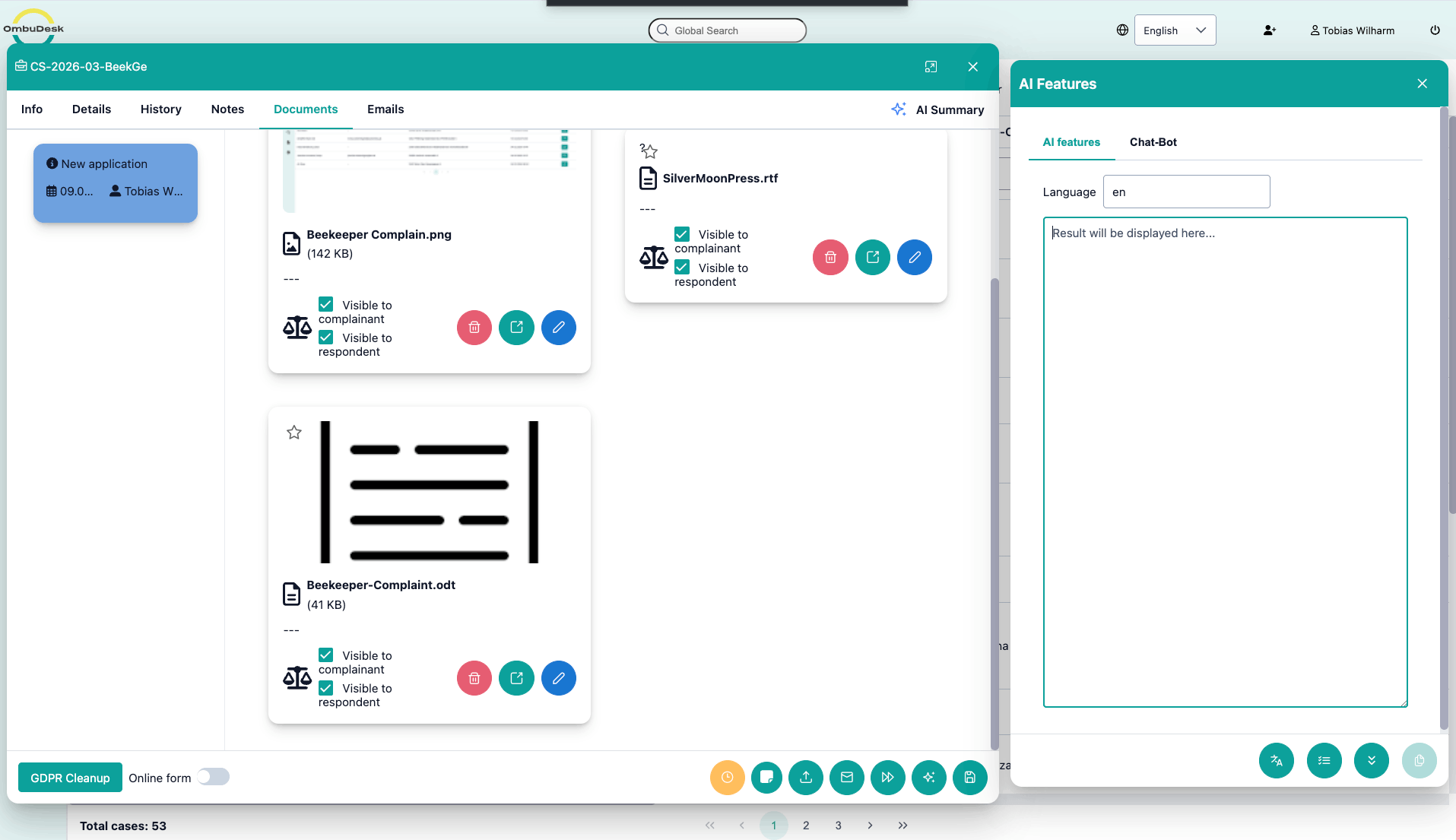 The OmbuDesk chatbot can be enabled for case managers and conciliators. You can integrate a language model (LLM) of your choice here. The chatbot is familiar with the details of a case and can assist you by answering specific questions.