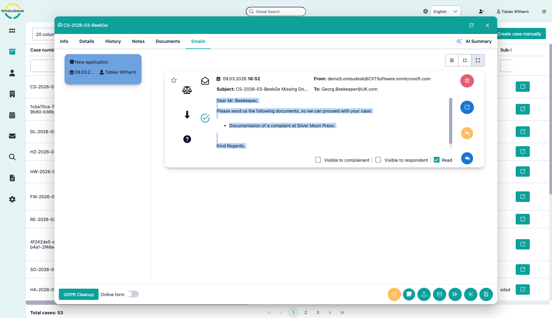 OmbuDesk supports the storage, visibility, and sending of documents at different levels. All parties can upload documents to a complaint. Documents are initially visible in the complaint to the sender and to the dispute resolution body. However, the case manager can extend visibility to other parties. All documents received as email attachments are also automatically added to the complaint. From there, they can be forwarded and their visibility modified. In addition, the dispute resolution body can store standard documents, which can then be sent to other parties or released to them as needed, including in conjunction with email templates.